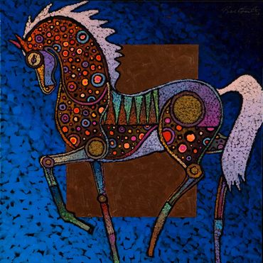 His work draws inspiration from mythology, nature, and global artistic traditions, including Native American, Celtic, Asian, and ancient Mediterranean influences. Echoes of artists such as Klimt, Chagall, Matisse, and Miró can be felt, while the voice remains distinctly his own.