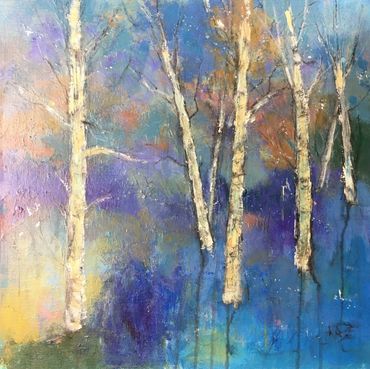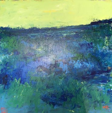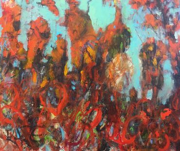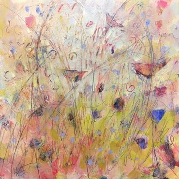 Her process is intuitive and energetic. Calligraphic brushstrokes, fragments of words, and layered patterns emerge freely, guided by dreams, memory, and emotion. Rather than controlling the outcome, she allows the work to unfold, often discovering meaning only as the painting reveals itself.